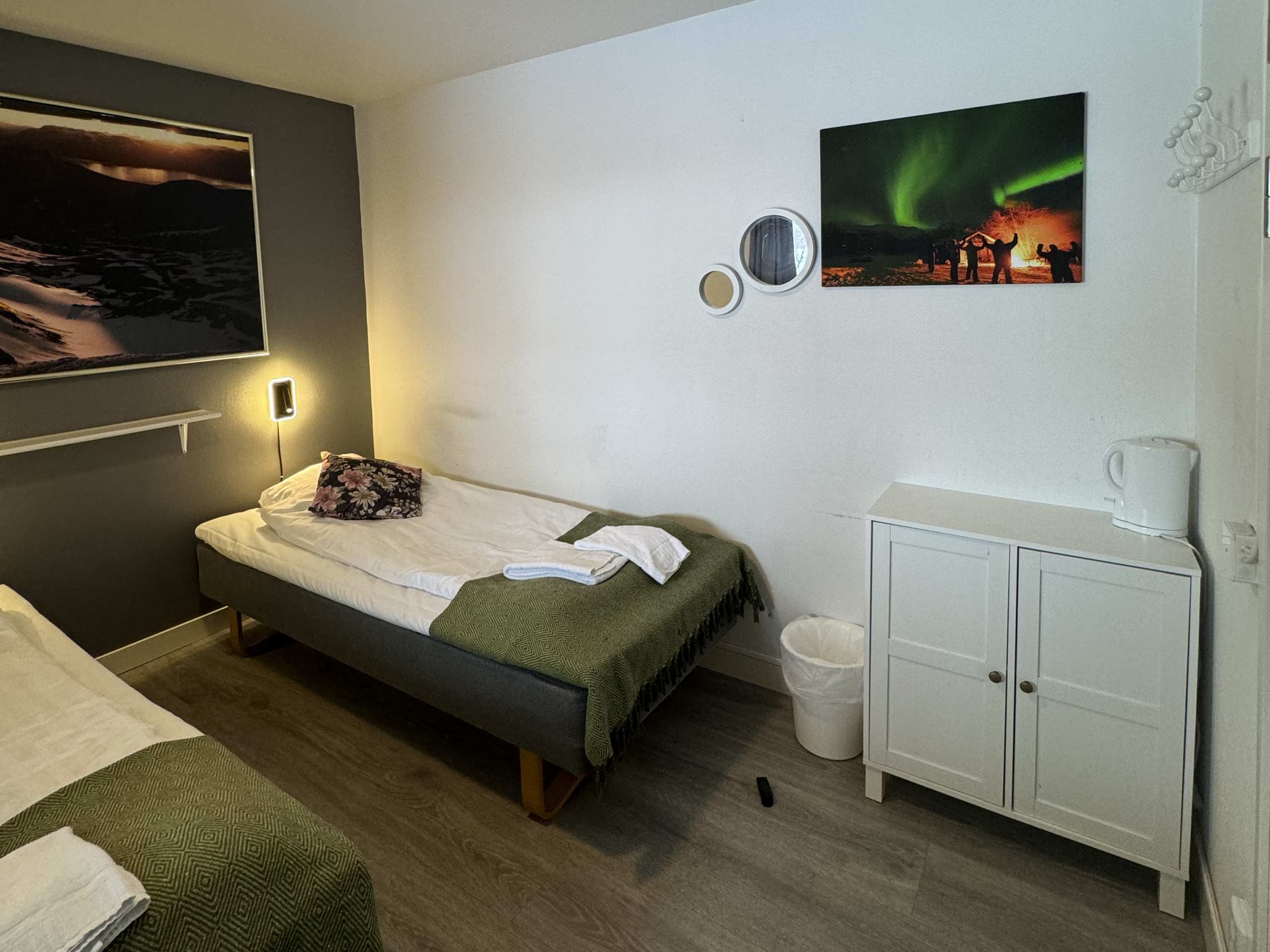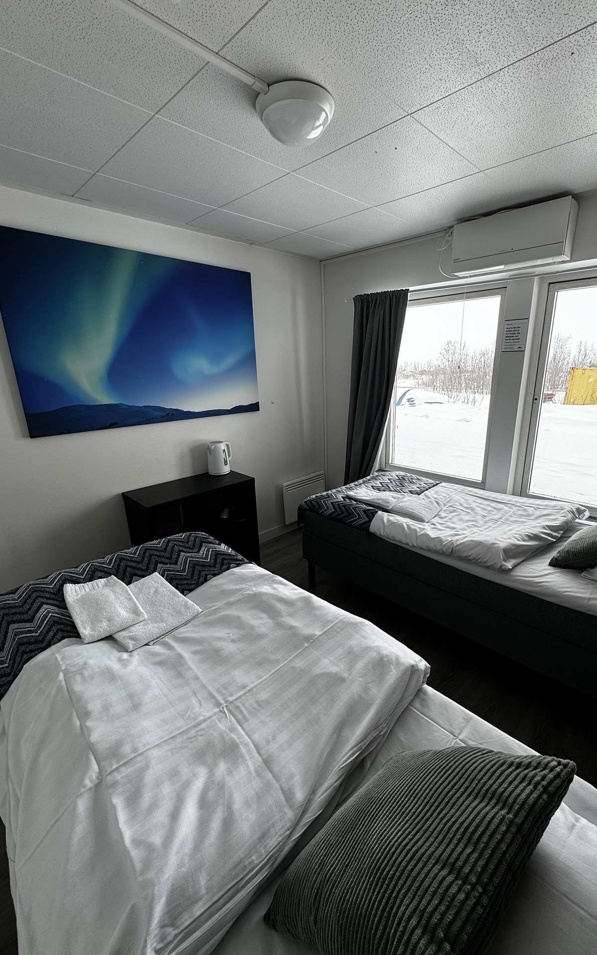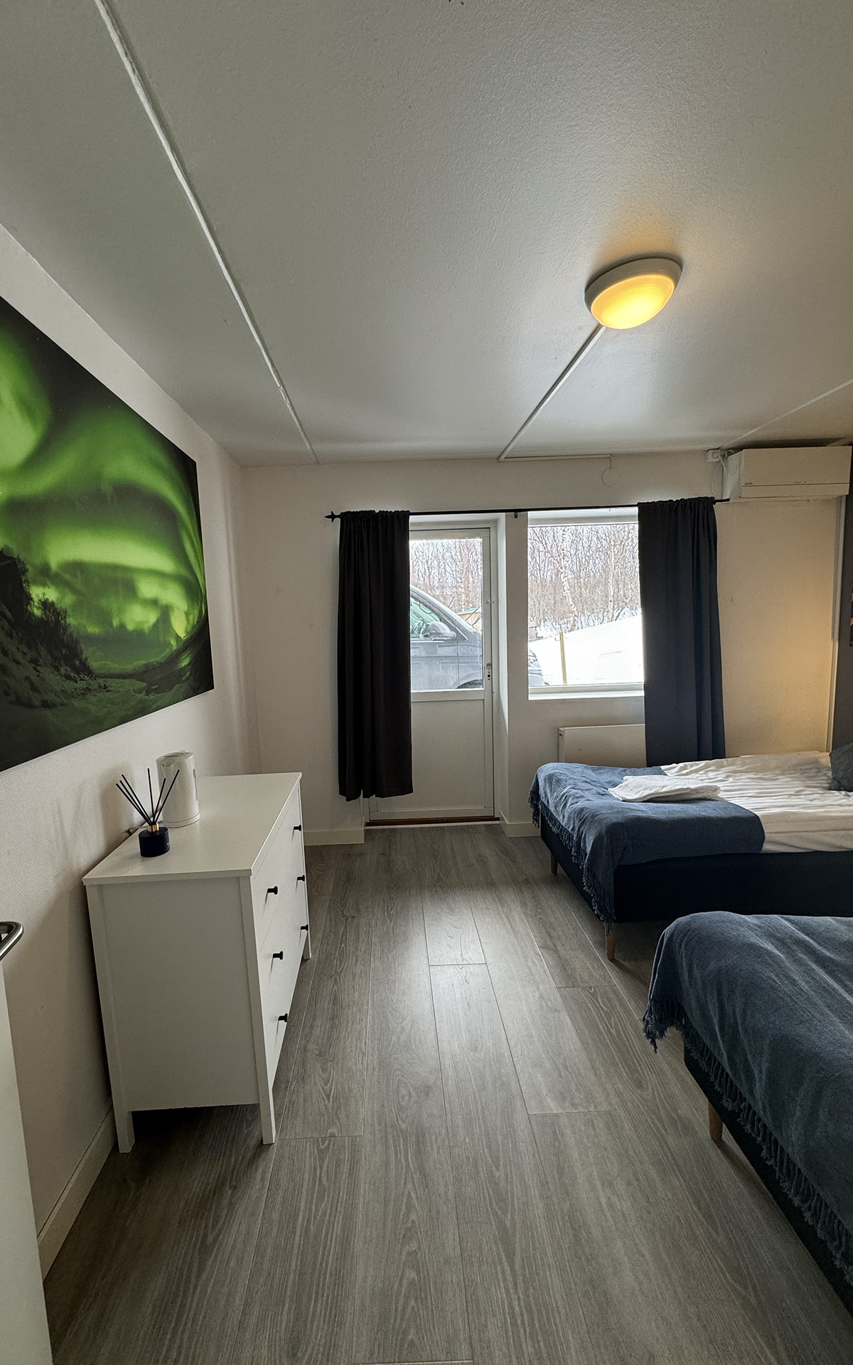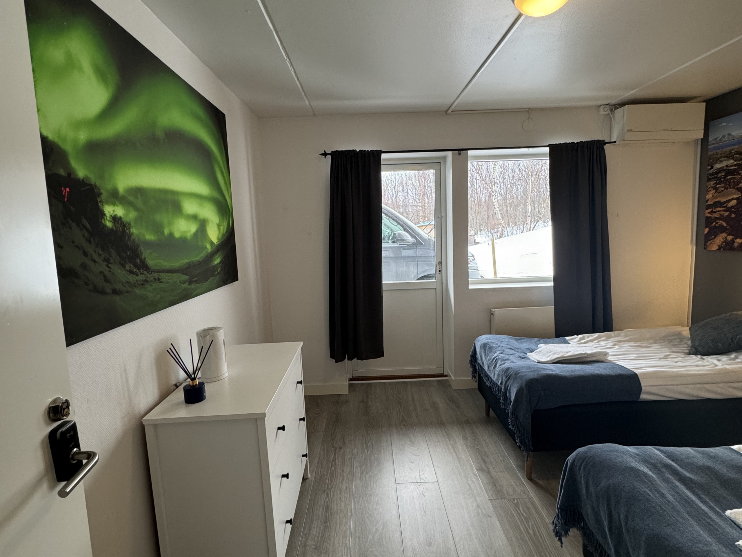 The hostel offers four private twin rooms, with access to a communal kitchen, bathrooms, and a small lounge space. Open from April to October, the hostel is a great place to meet fellow travelers, swap stories, and plan adventures in the Abisko wilderness. Our hostel occupies the lower level of the property, with its own dedicated entrance. This setup makes it simple for guests to come and go as they please, while keeping the hostel a cozy and self-contained space.
