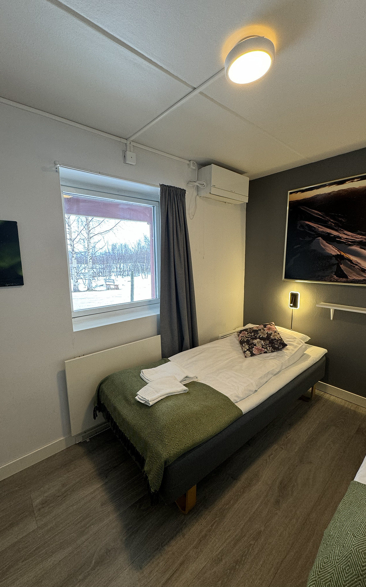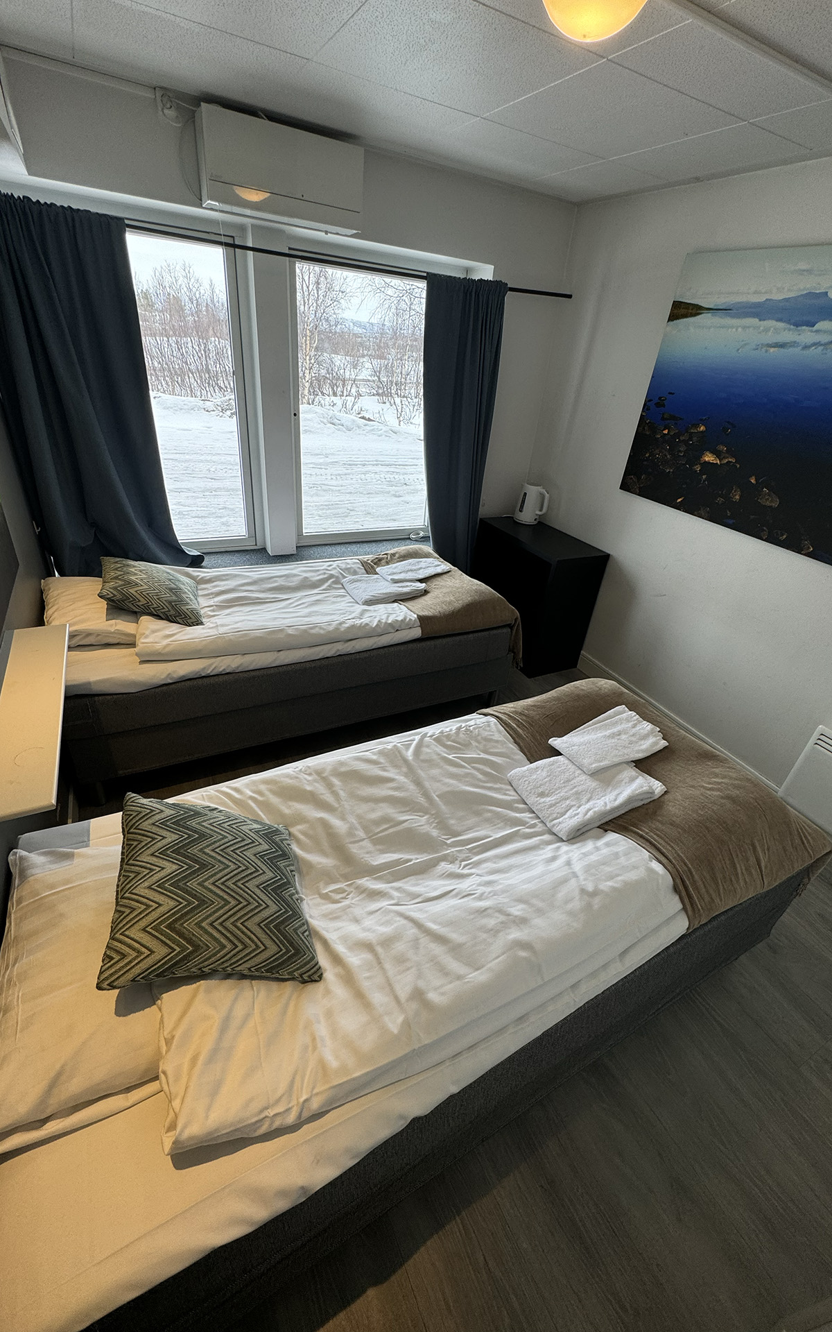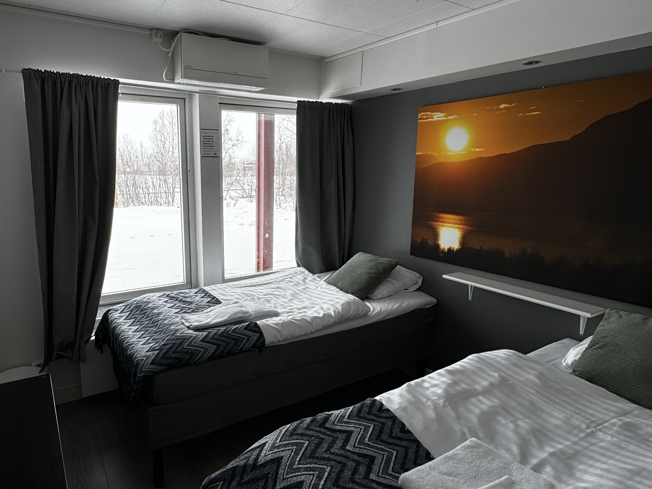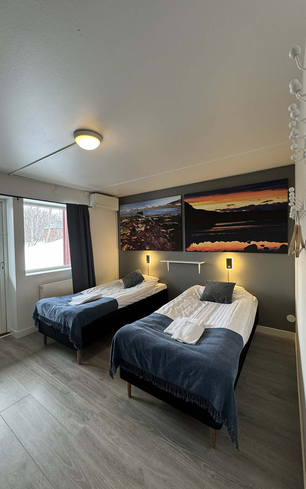 The hostel offers four private twin rooms, with access to a communal kitchen, bathrooms, and a small lounge space. Open from April to October, the hostel is a great place to meet fellow travelers, swap stories, and plan adventures in the Abisko wilderness. Our hostel occupies the lower level of the property, with its own dedicated entrance. This setup makes it simple for guests to come and go as they please, while keeping the hostel a cozy and self-contained space.