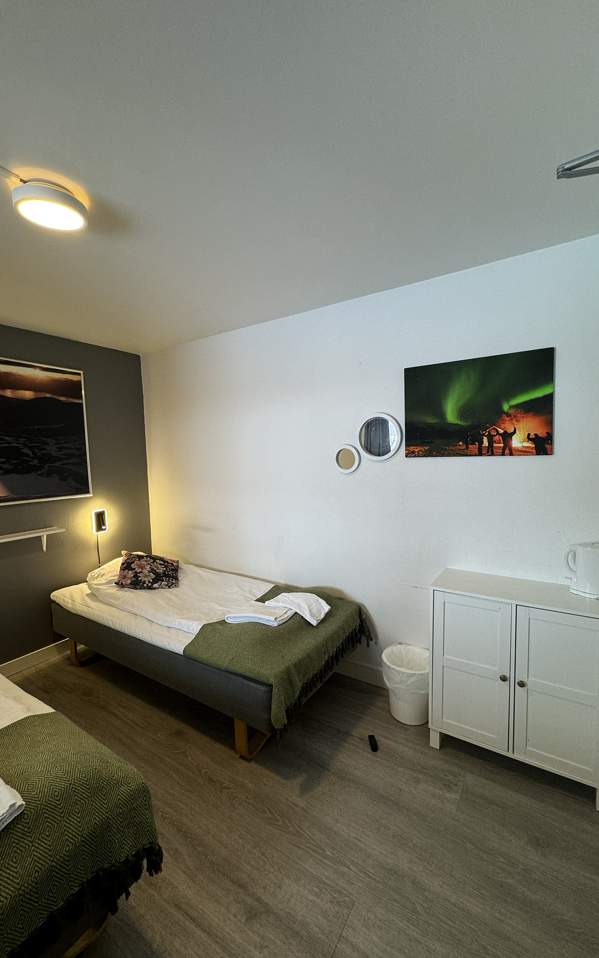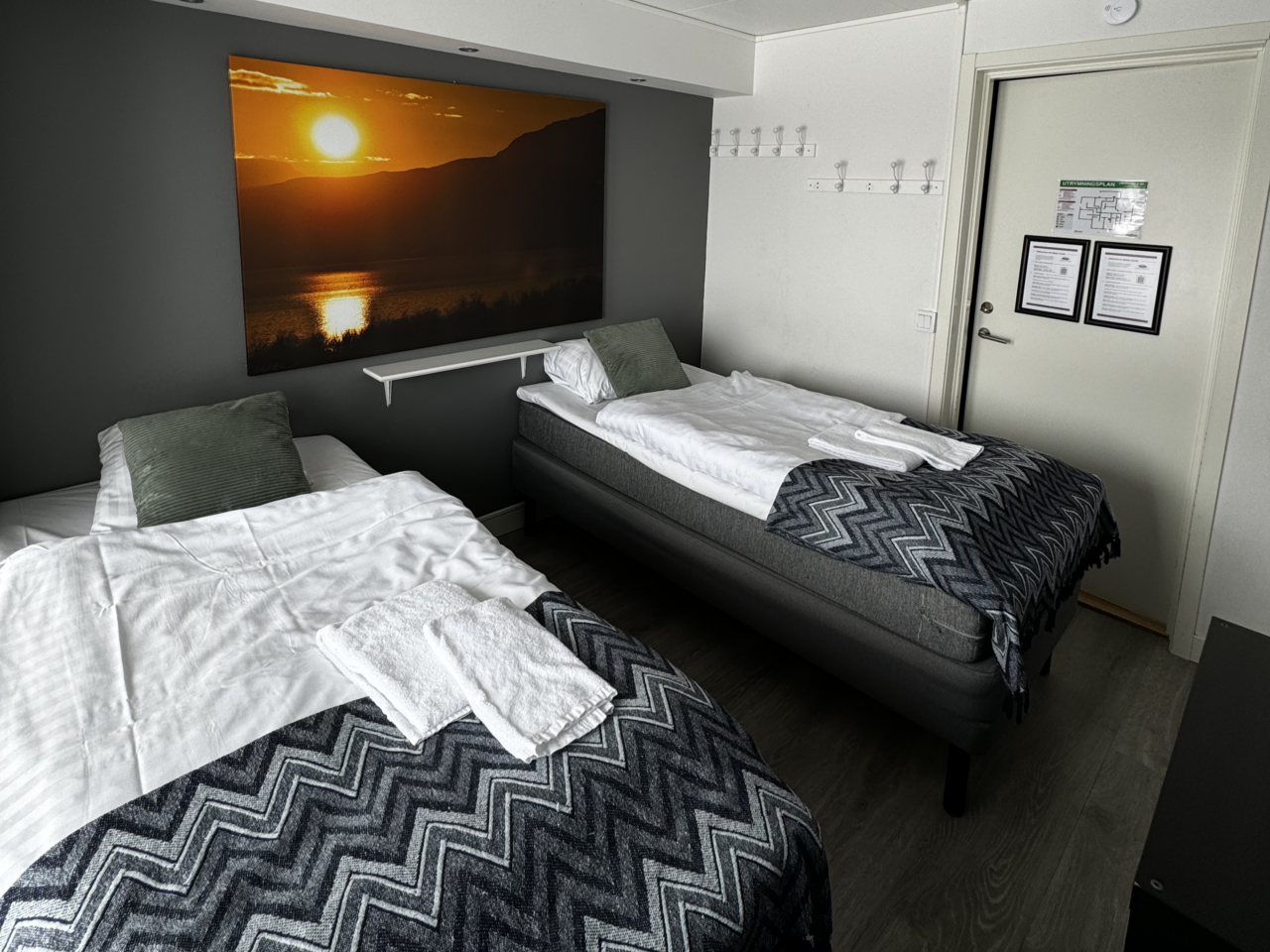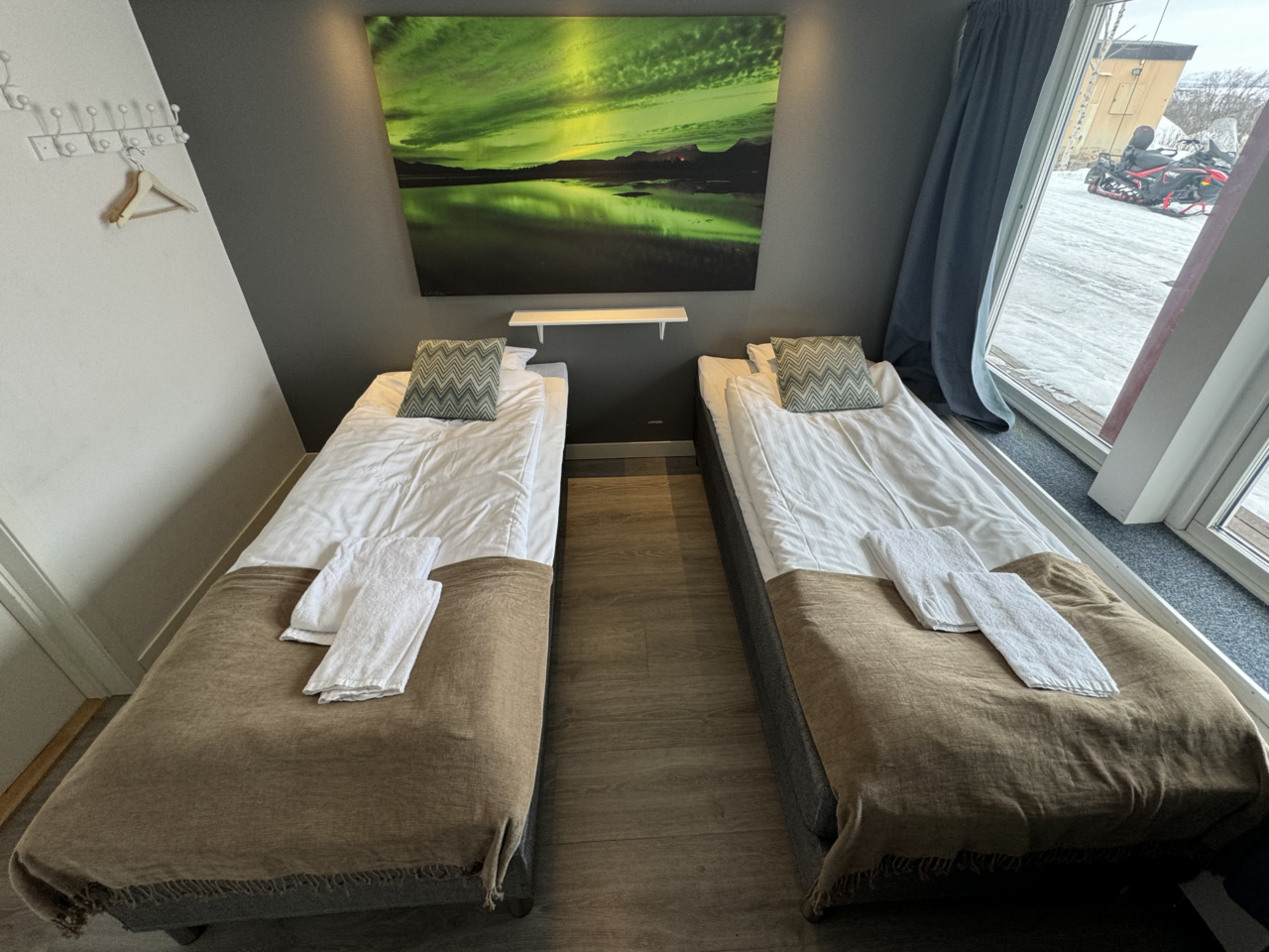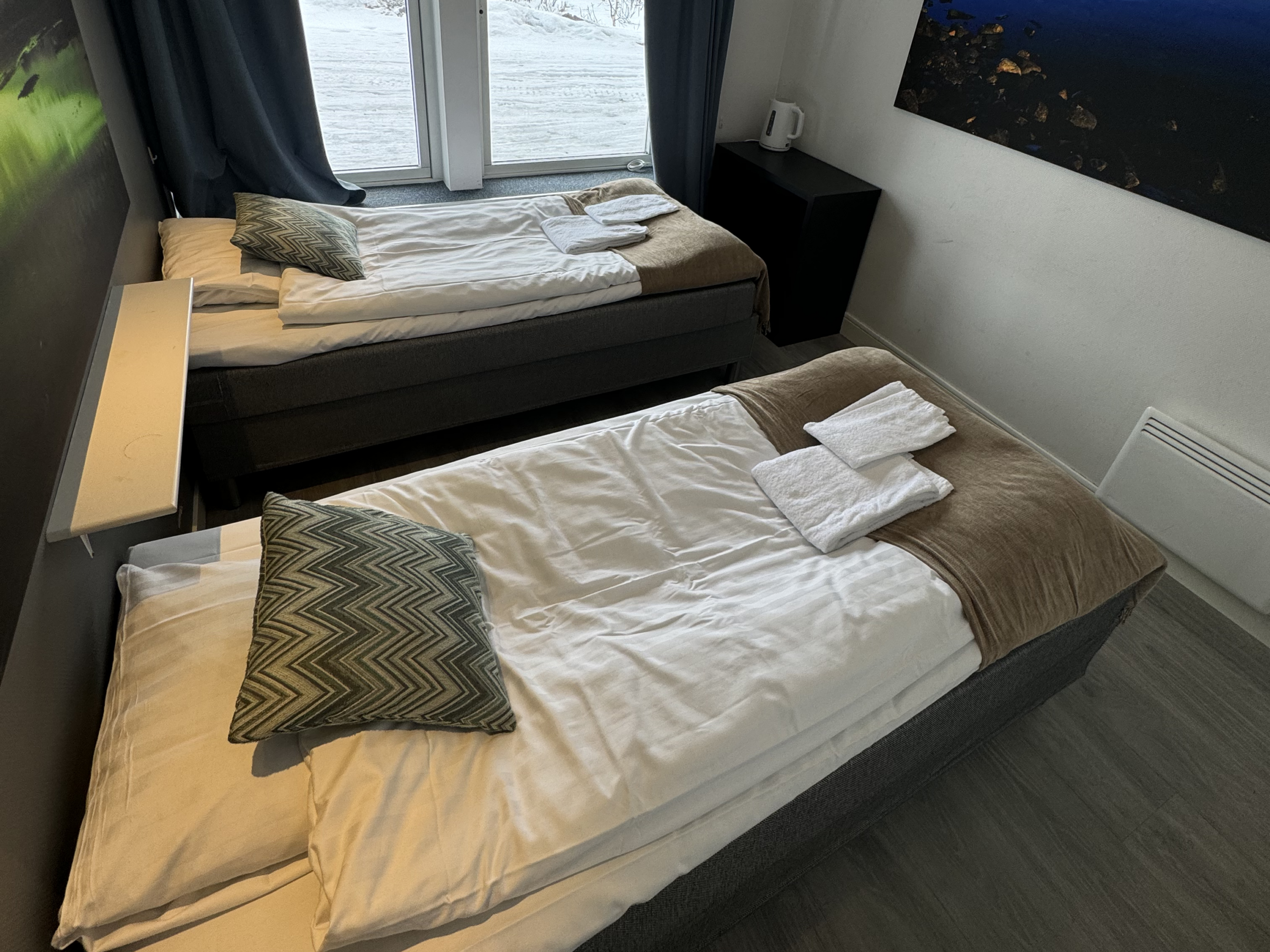 The hostel offers four private twin rooms, with access to a communal kitchen, bathrooms, and a small lounge space. Open from April to October, the hostel is a great place to meet fellow travelers, swap stories, and plan adventures in the Abisko wilderness. Our hostel occupies the lower level of the property, with its own dedicated entrance. This setup makes it simple for guests to come and go as they please, while keeping the hostel a cozy and self-contained space.